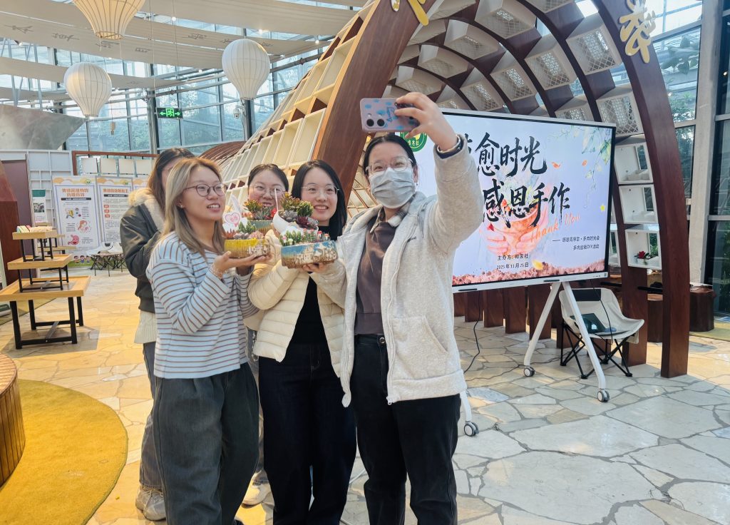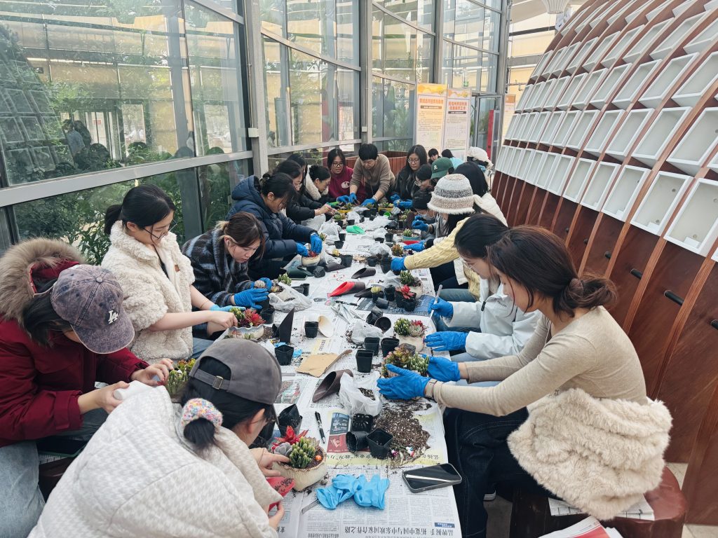 2025年11月25日,和衷社在药植所内全国最大、保存物种最多的国家药用植物园体系本草生态温室举办“植愈时光,感恩手作”多肉创意盆栽DIY活动,40余名学生踊跃参加,以绿植为媒传递感恩暖意。